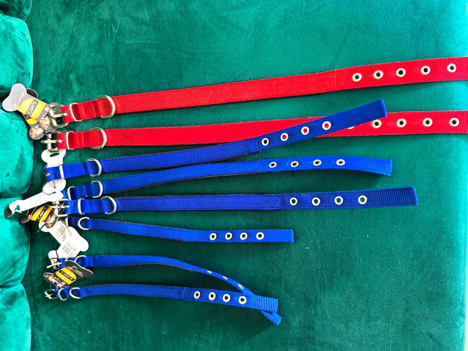 Ayarlanabilir deliklere sahip kırmızı ve mavi renkli köpek tasması , farklı boyutlara uygundur. Dayanıklı ve canlı tasarım.