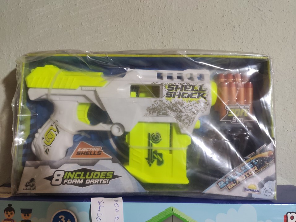 Beyaz ve neon sarı detaylı renkli oyuncak tabanca, köpük mermiler ve çıkarılabilir kabuklarla birlikte gelir.