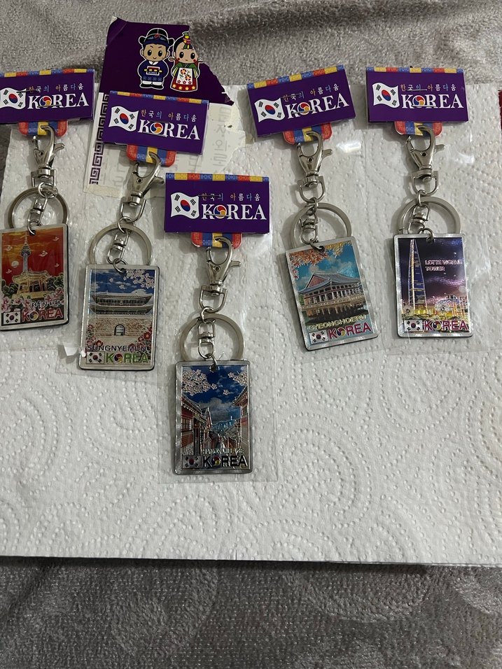 Farklı Kore temalı renkli anahtarlıklar, metal halka ve klips ile birlikte. Üzerlerinde 'KOREA' yazılı etiketler bulunur. ️