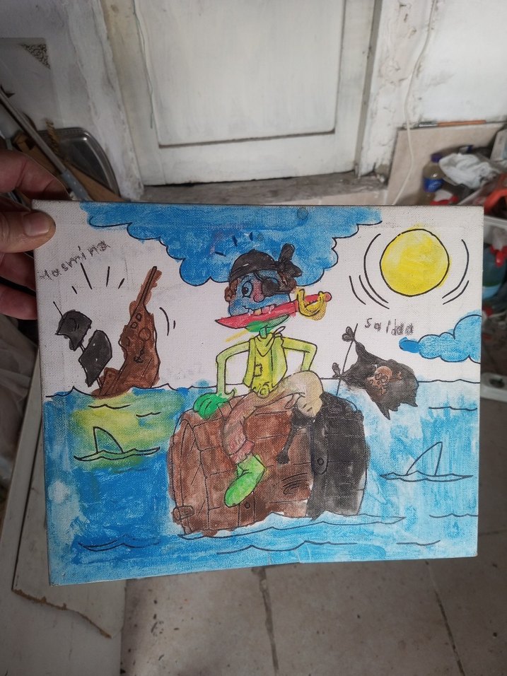 Bu sanat kitabı, okyanus dalgaları ve köpekbalıkları arasında kayalıkta oturan renkli korsan temalı çizimler içeriyor ☠️.