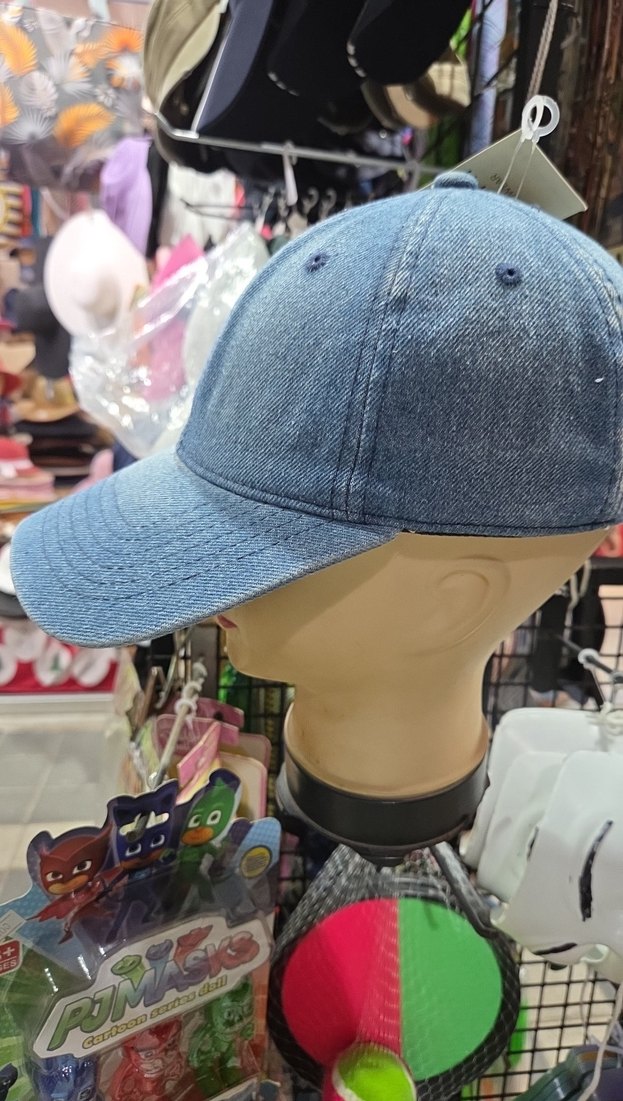 Mavi kot kumaştan, renkli ve Velcro ayarlı kadın şapka, sokak stili için uygun ve trend görünümlü.