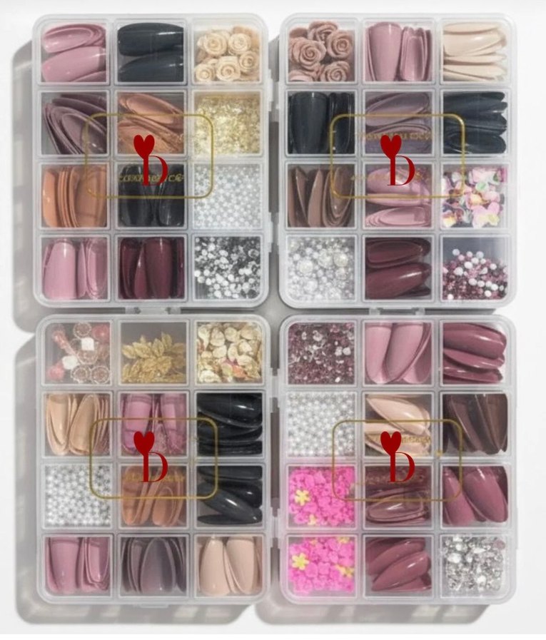 Çeşitli koyu ve çok renkli tırnak süslemeleri, yapay tırnaklar, inciler, çiçekler ve sim parçaları içeren set.