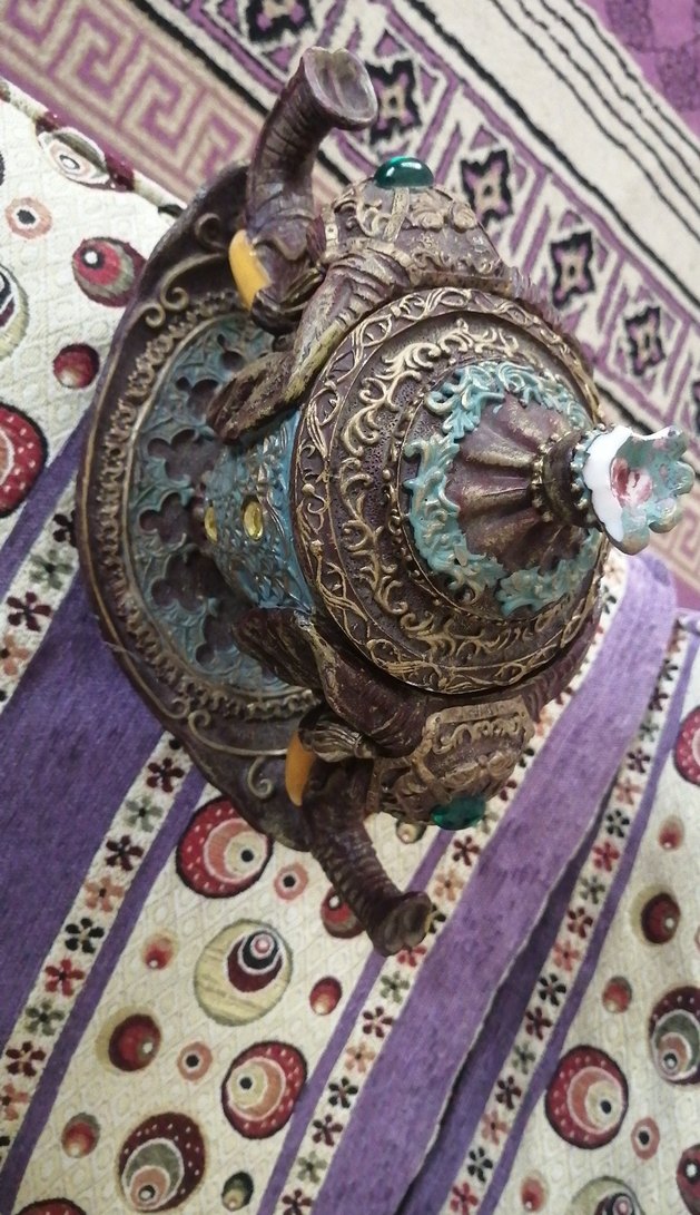 Koyu ve çok renkli detaylara sahip, işlemeli porselen demlik. Süslemeli kulp ve kapak ile dikkat çeker.