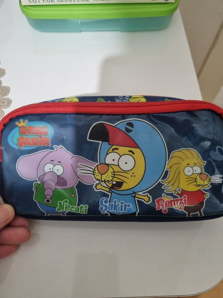 Renkli Kral Şakir karakterleri Necati, Şakir ve Remzi figürlü çocuk kalem kutusu, kırmızı fermuarlı ve çok renkli tasarıma sahip. bir sorunu yok sadece fermuarında renk atması vardır