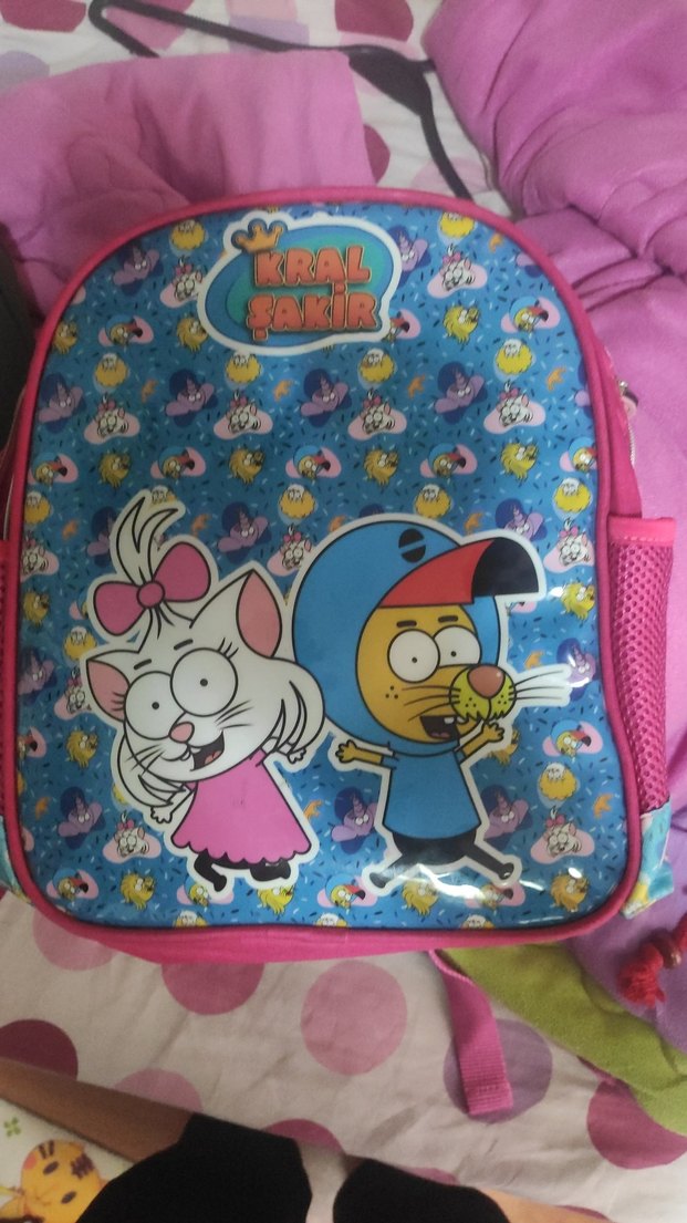 Renkli Kral Şakir figürlü pembe çocuk okul çantası, yanlarında file cepler bulunmaktadır. Greyder den alındı orjinal lisanslı anaokulu na uygun sorunsuz