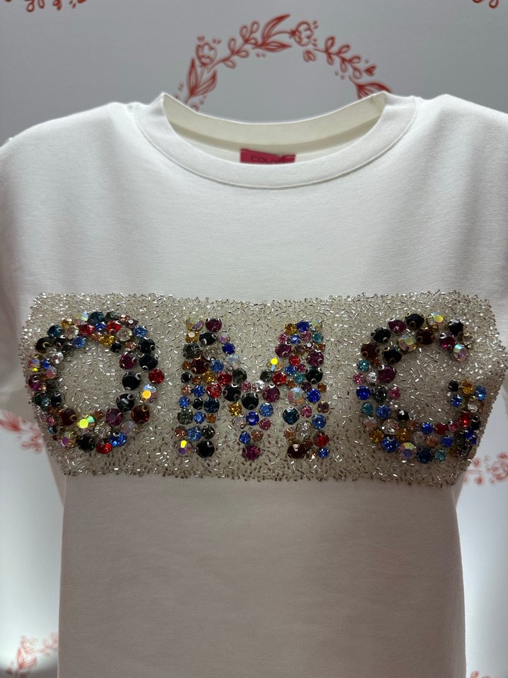 Beyaz kadın tişört, önünde "OMG" yazan renkli kristal taşlı baskıya sahip. Yuvarlak yaka, kısa kollu, ışıltılı tarzda, parti için ve günlük giyimde uygundur ✨