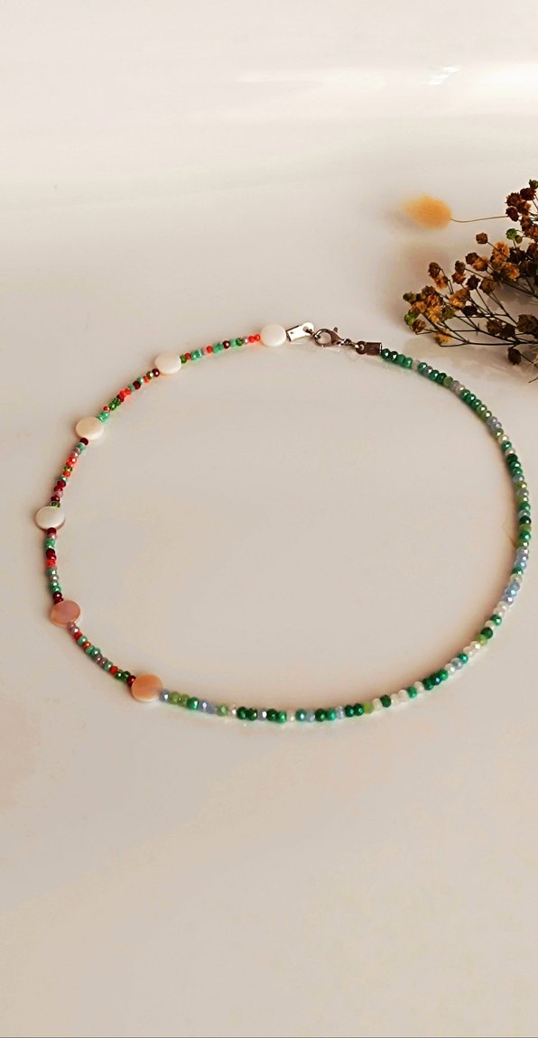 Lütfen Almadan önce Yeni bir ilan açtırınız Çelik tel üzerine dizili Bohem tarzda, tie-dye desenli, Sedef taşı ve renkli Kristal boncuklardan oluşan normal uzunlukta midi kolye.