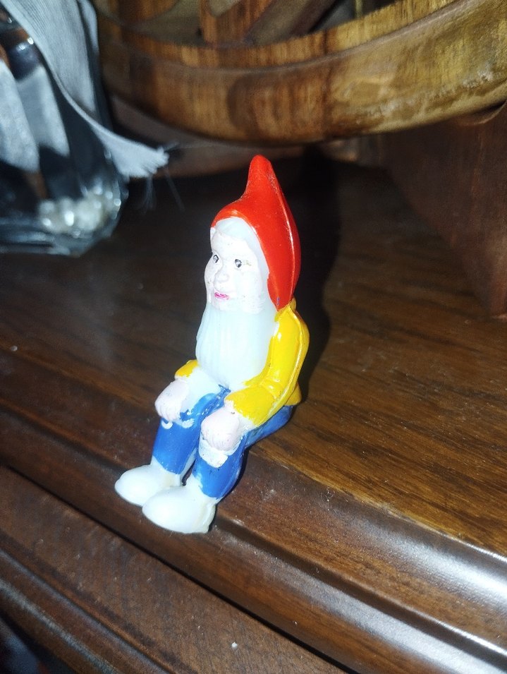 Kırmızı şapkalı, sarı gömlekli, mavi pantolonlu ve beyaz ayakkabılı renkli cüce figürin. ‍♂️