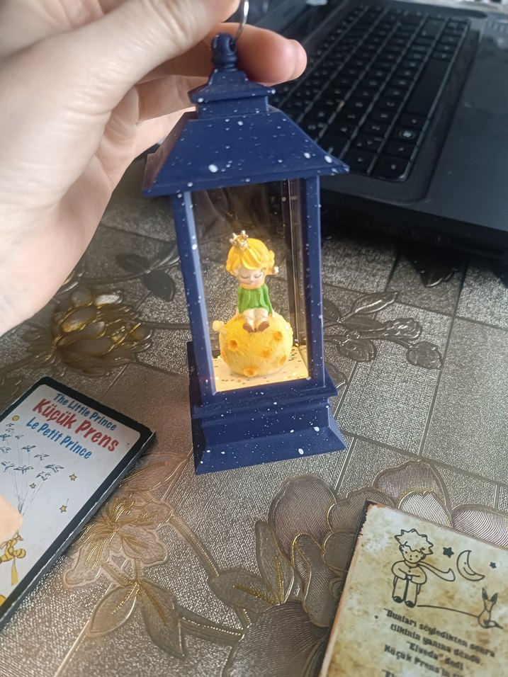Küçük Prens figürünün sarı gezegende oturduğu, koyu mavi ve beyaz benekli renkli fener. Birine hediye almıştım fakat vermek nasip olmadı yeni aldım hiç kullanılmadı ışığı yanıyor