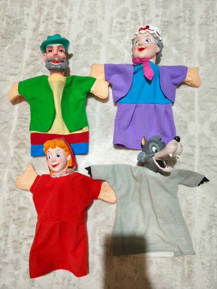 Yumuşak kumaştan yapılmış, çeşitli karakterlere sahip dört renkli el kuklası seti. Hayal gücünü destekler. hiç kullanılmadı