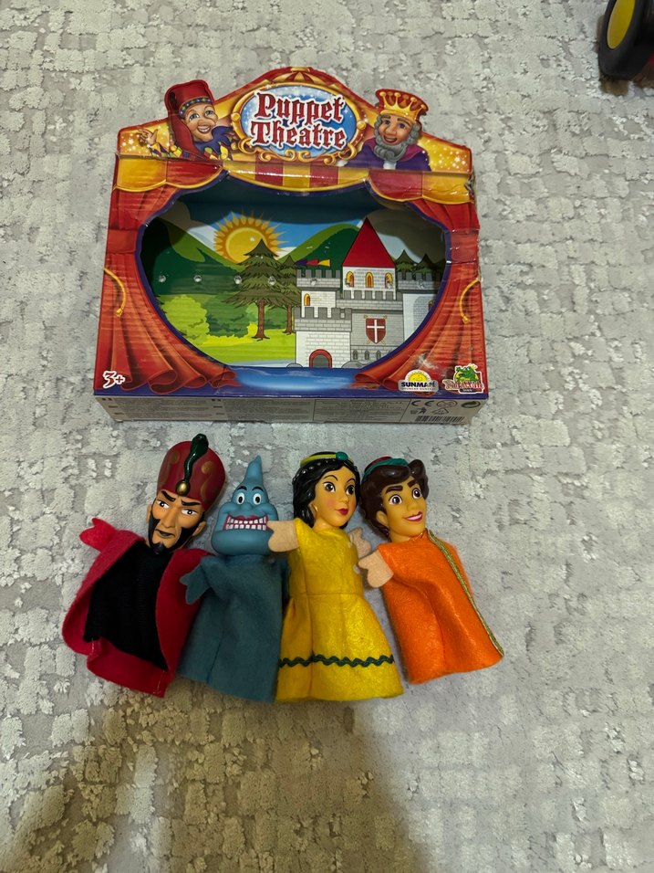 Bu renkli kukla tiyatrosu seti, dört el kuklası ve kale sahneli canlı bir tiyatro fonu içerir.