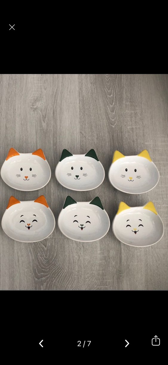 Altı adet renkli kulaklı ve sevimli yüz ifadeli, dayanıklı ve pürüzsüz malzemeden yapılmış kedi mama kabı seti.
