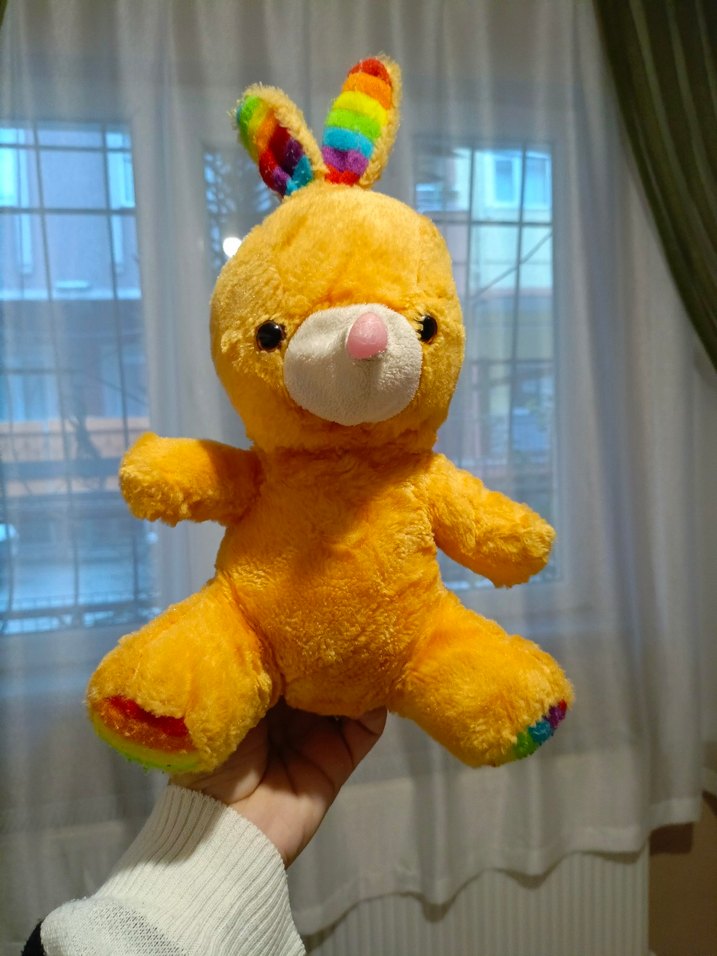 Renkli gökkuşağı kulakları ve ayakları olan sarı peluş oyuncak. Yumuşak ve sevimlidir, oyun veya dekorasyon için uygundur.