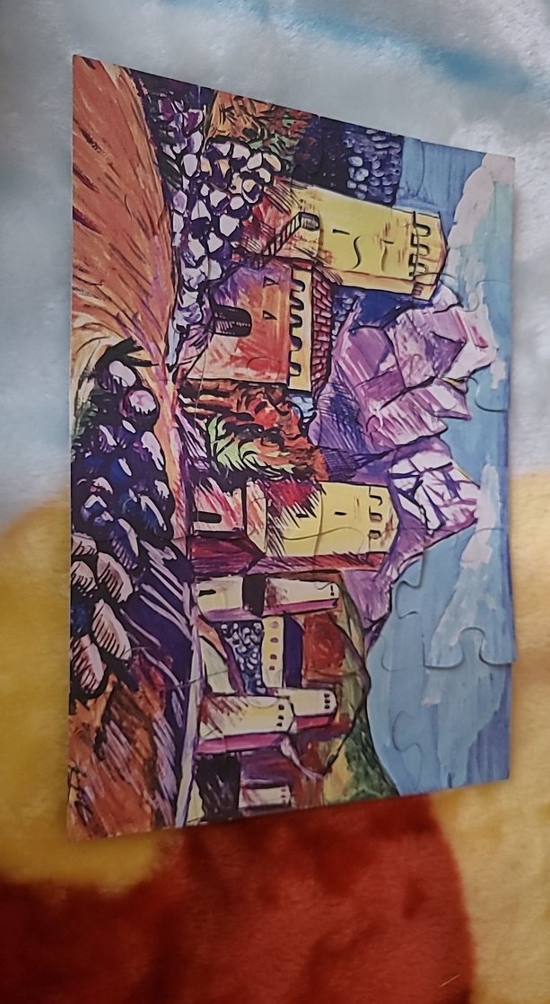 Kuleler ve dağların karanlık ve canlı renklerle çizildiği renkli bir puzzle. 20 parcalı