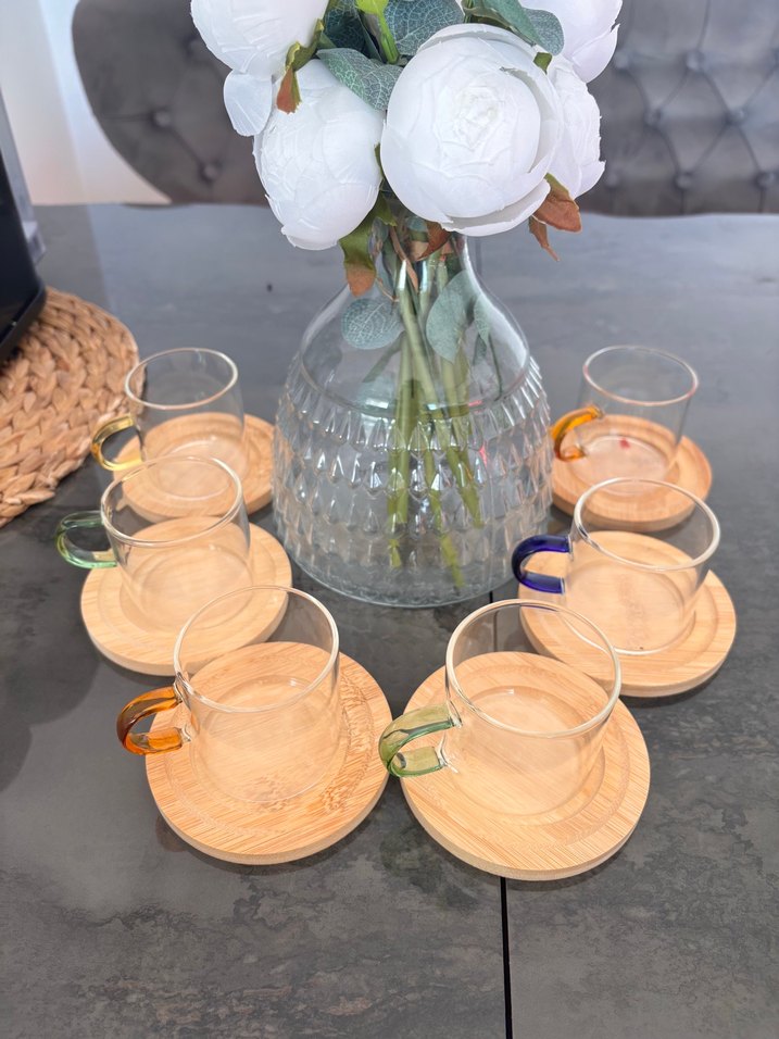 Renkli kulplara sahip cam fincanlar, yuvarlak ahşap altlıklarla birlikte sunuluyor. Set, beyaz çiçekli cam vazoya çevrelenmiş.