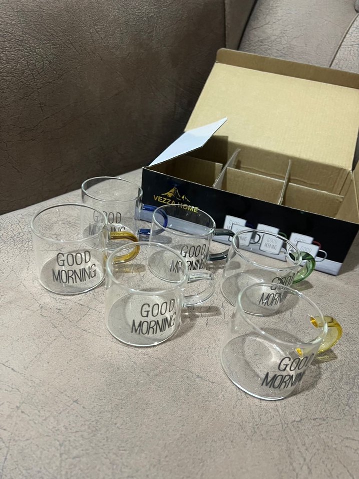 Renkli kulplara sahip cam kahve fincanları setidir. Her fincanda "GOOD MORNING" yazısı yer alır. ☕