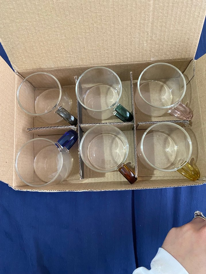 Altı adet renkli kulplu şeffaf cam kupadan oluşan set. Her kulp farklı canlı renkte, sıcak içecekler için uygun. ☕️