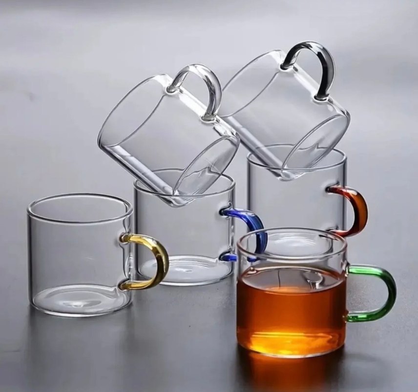 Çeşitli renklerde kulplara sahip şeffaf cam bardaklar, içecek servisi için uygundur. Her bardakta farklı canlı renkli kulp bulunur. Kahve fincanı boyutunda