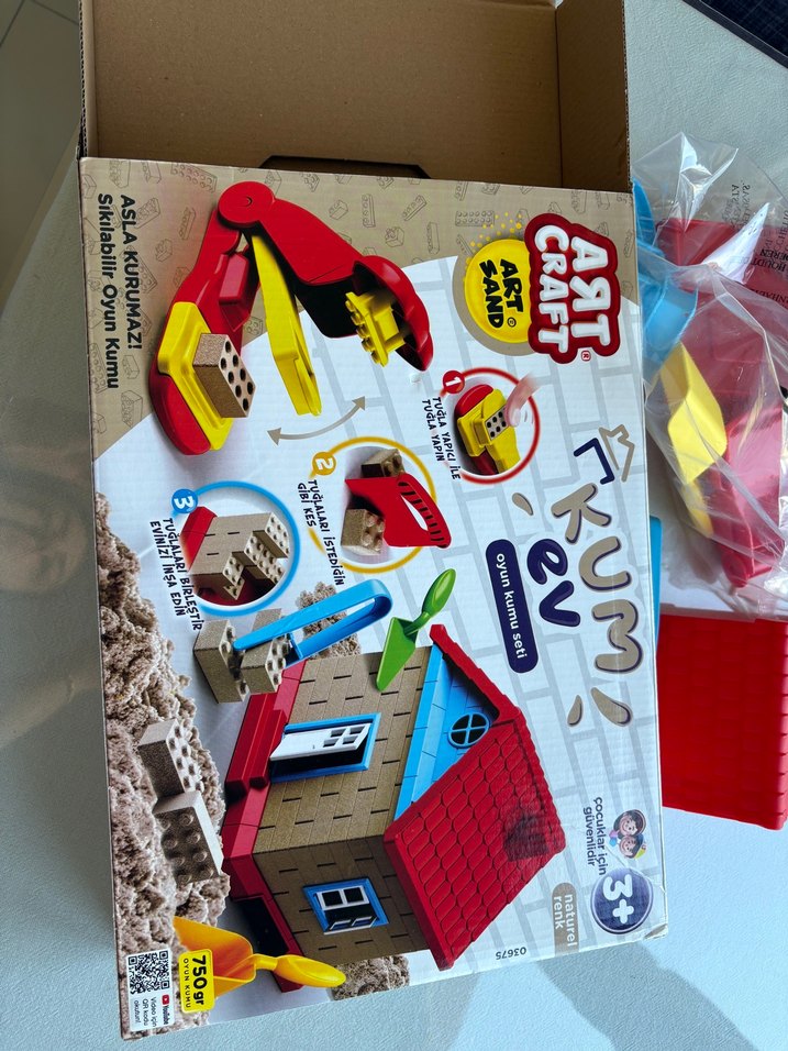 750 gram kinetik kum ve ev modeli yapmak için araçlar içeren renkli eğitici oyuncak seti, yaratıcılığı ve el becerilerini destekler. İçerisinde sadece kumlar eksik diğer bütün parçalar tam