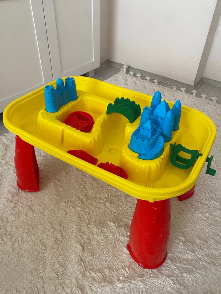 Kırmızı ayaklı, sarı renkli kum masası ve mavi-yeşil kale kalıplarıyla yaratıcı oyun için uygundur.
