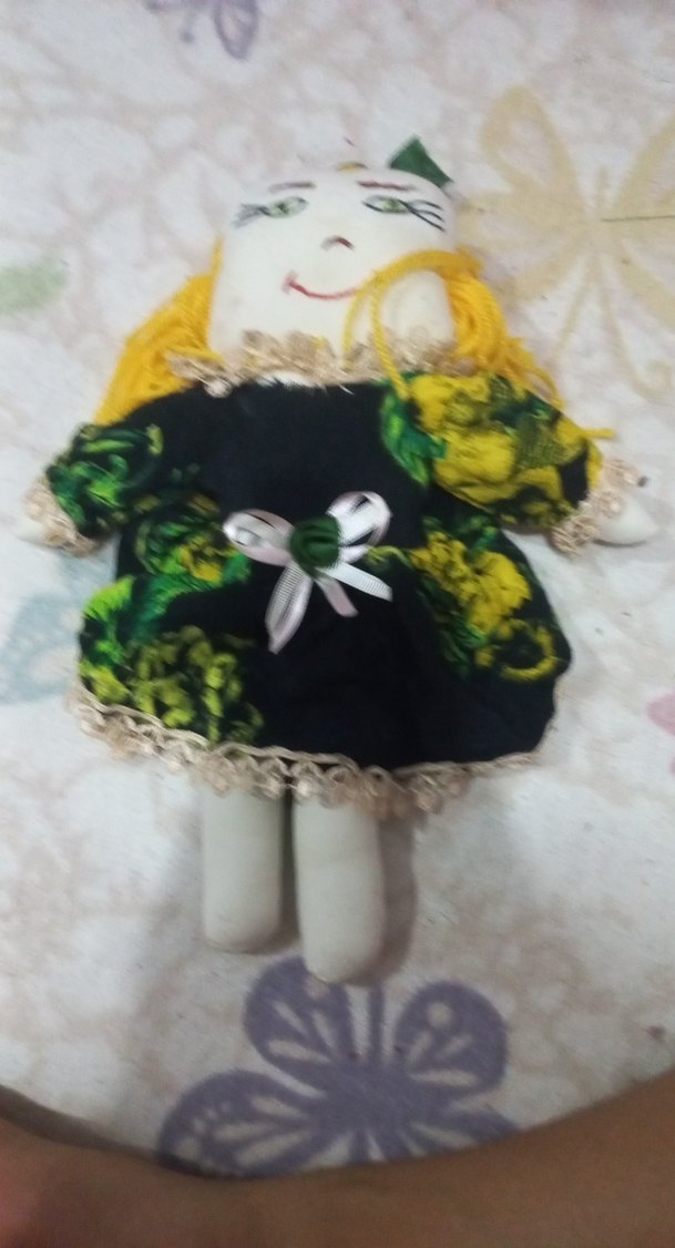 Renkli kumaştan yapılmış, çiçek desenli detaylı elbisesi ve sarı ipten saçı olan sevimli bir bebek.