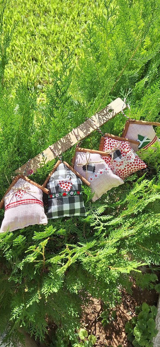 Renkli kumaştan yapılmış, ahşap ipte bağlı ev şeklinde dekoratif süsler, ev dekorunuza sıcaklık katar. adet fiyatı