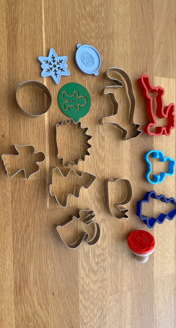 Hayvanlar, ağaçlar ve tatil sembolleri gibi çeşitli şekillerde renkli kurabiye kalıpları seti. Yaratıcı hamur işleri için uygundur.