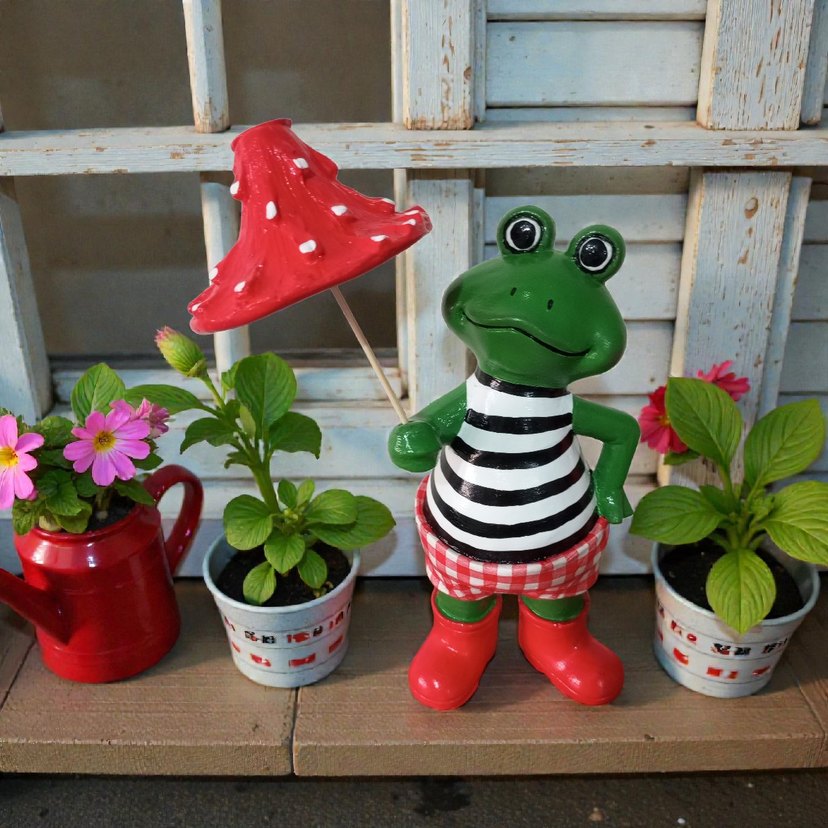 Desenli kıyafetler ve botlar giymiş renkli kurbağa biblolar, dekoratif kullanım için uygundur.