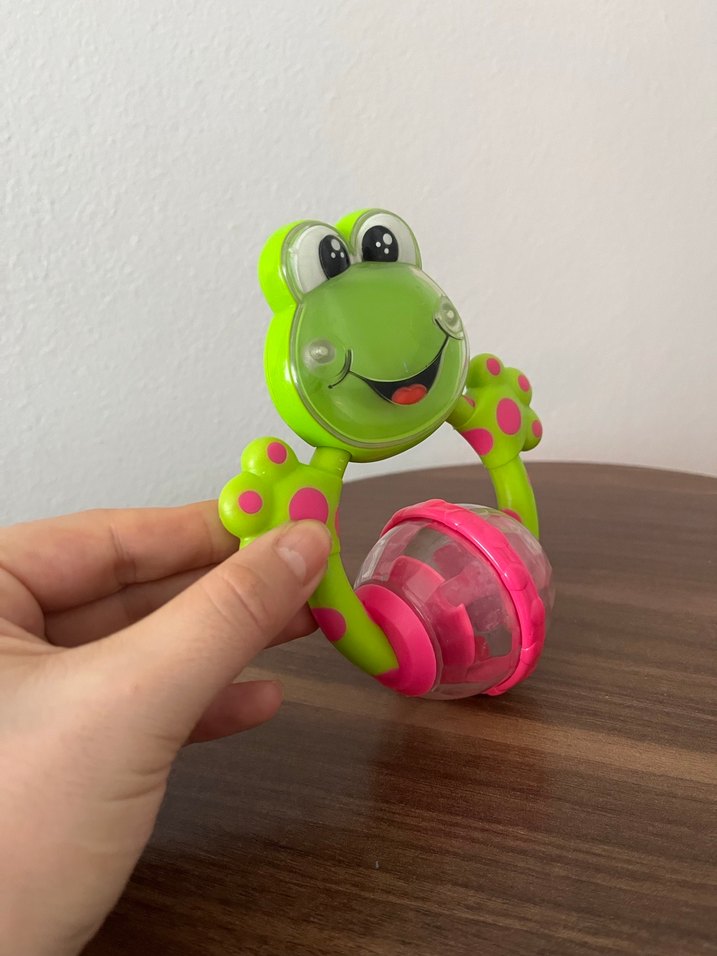 Gülen yeşil kurbağa şeklinde, pembe detaylı renkli diş kaşıyıcı ve çıngırak. Bebeklerin güvenle çiğneyip oynaması için tasarlanmıştır.
