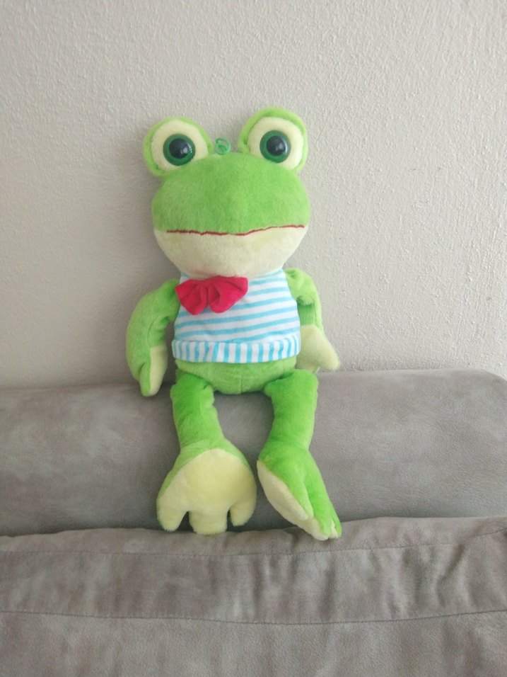 Mavi beyaz çizgili gömlek ve kırmızı papyon takan renkli kurbağa peluş oyuncak. Yumuşak ve kucaklanabilir, büyük gözlü.