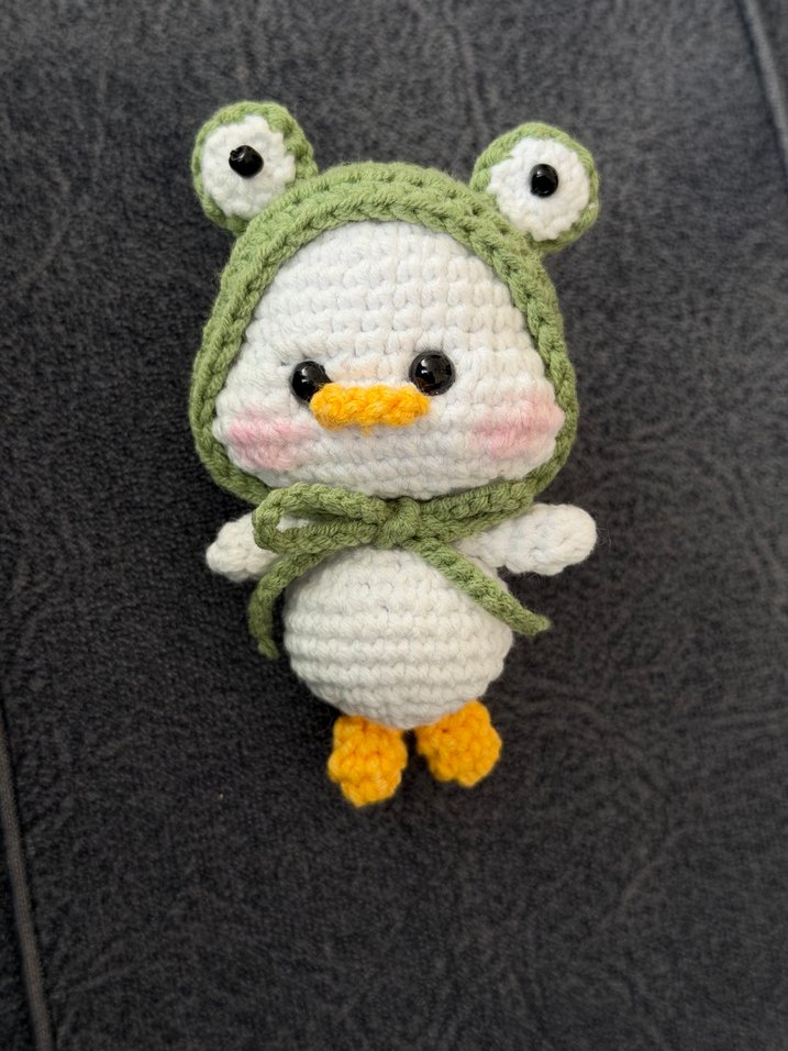 Yeşil kurbağa şapkalı, siyah gözlü ve turuncu ayaklı örgü peluş oyuncak. Yumuşak ve detaylı dokusu vardır.