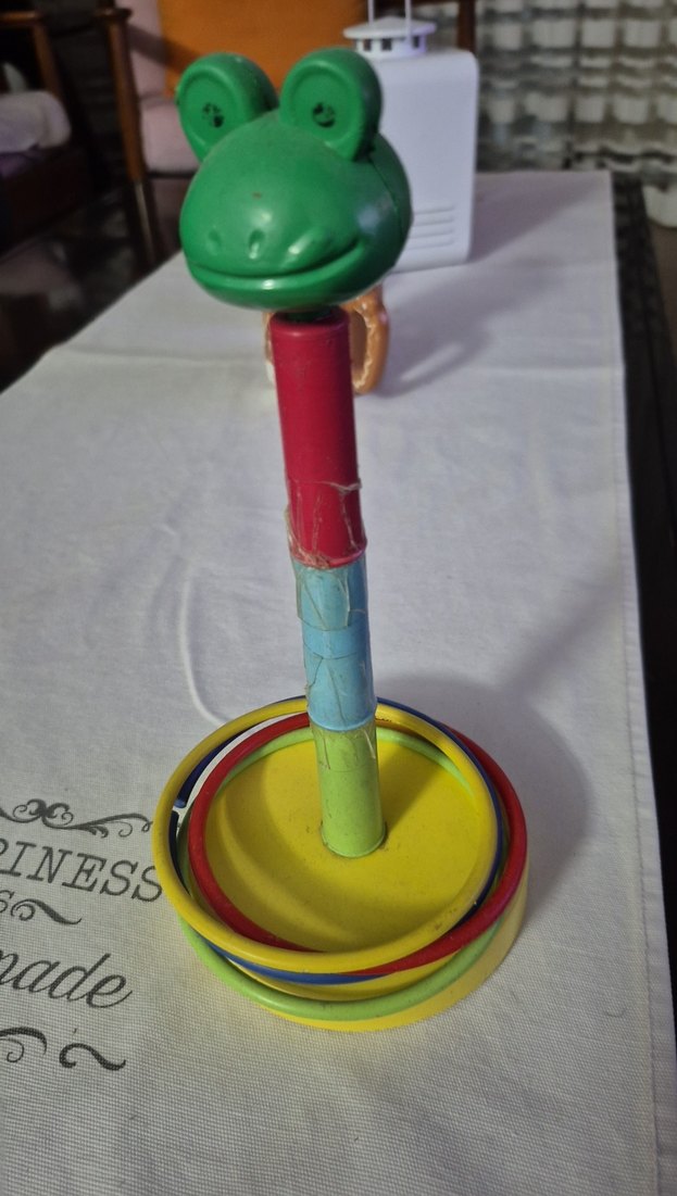 Renkli halkaların kurbağa başlı direğe takıldığı eğitici oyuncak, el-göz koordinasyonu ve renk tanımayı destekler.