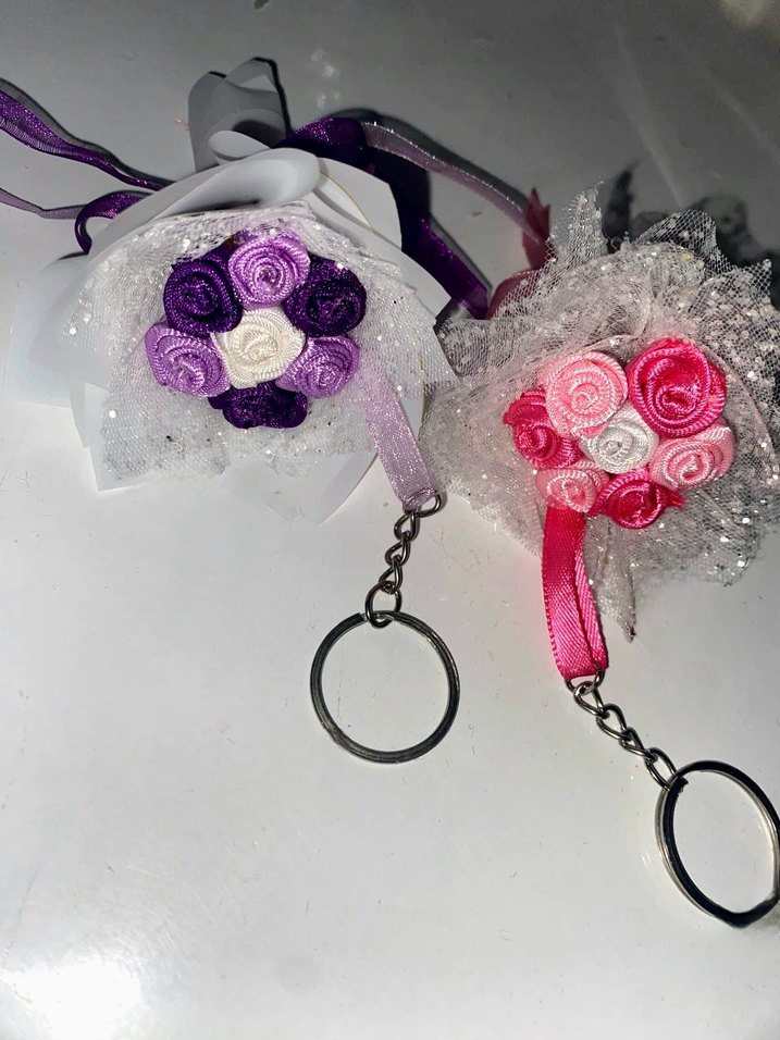 Mor ve pembe tonlarında kurdela güller ve ince dantel detaylı renkli, bohem tarzda anahtarlık. adet fiyatıdır