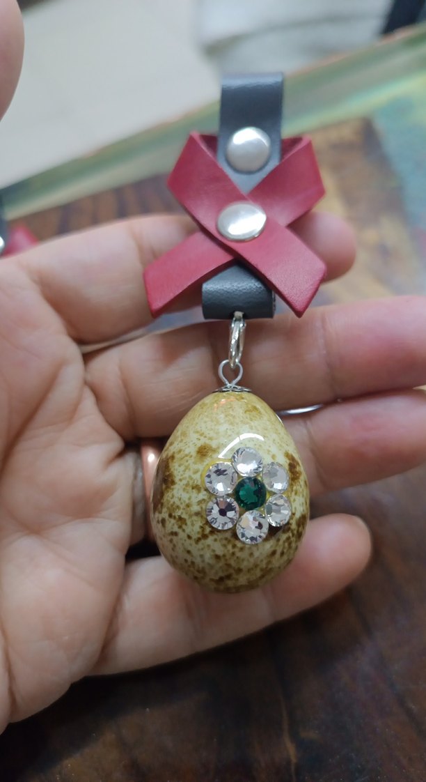 Bohem tarzda, kristallerle süslenmiş gerçek bıldırcın yumurtasi içi boşaltılarak firinlanmis ve sworoski itaslarla islenmiş bı model.. Türkiye de tek yapılan üründür Avangart modaseverlere uygun.