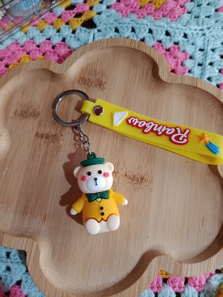 Sarı kurdele ve yeşil şapkalı, sarı kıyafetli ayıcık figürlü renkli anahtarlık. Streetwear tarzına uygun.
