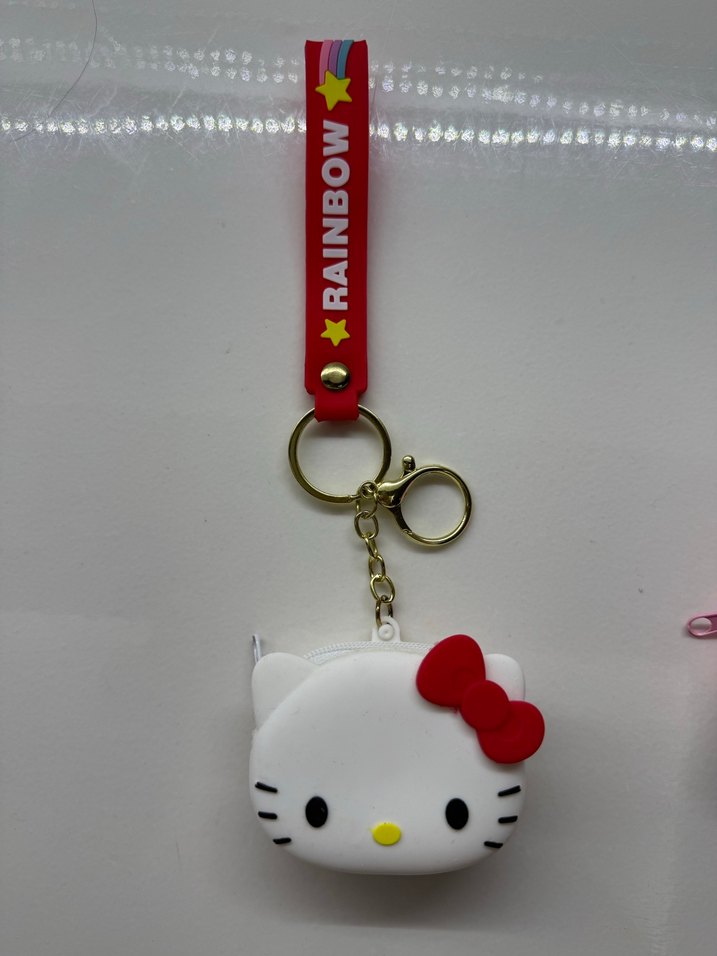 Beyaz Hello Kitty yüzü ve kırmızı kurdele detaylı, 'RAINBOW' yazılı renkli kurdeleli kadın anahtarlık. Minimalist ve rock punk tarzda.