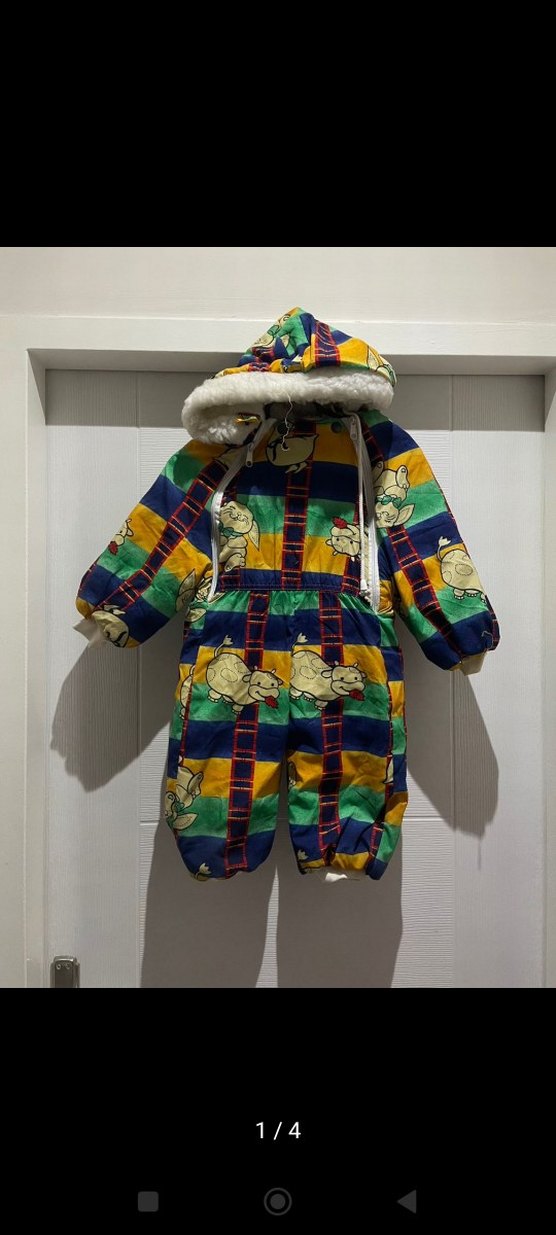 Renkli, kürklü detaylı bebek erkek tulumu, yumuşak ve sıcak kumaştan, kapüşonlu ve sokak modası stilinde.