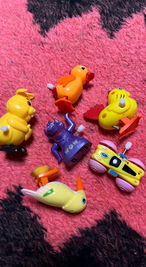 Farklı hayvan ve araç figürlerinden oluşan renkli kurmalı oyuncaklar.