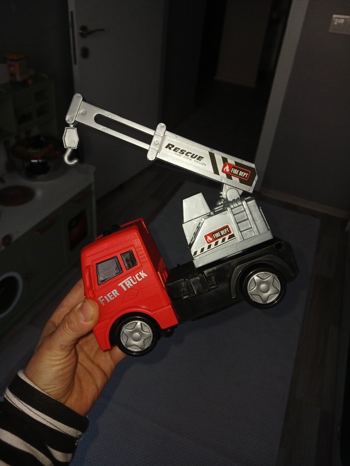 Kırmızı kabinli, gri vinç kolu olan renkli kurtarma oyuncak kamyon. Üzerinde 'FIER TRUCK' ve 'RESCUE' yazıları bulunur. Sesli Işıklı hareketli