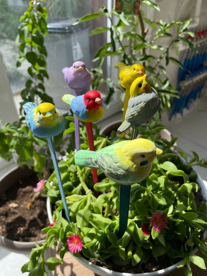 Bitkilere canlılık katan, renkli kuş figürleri. İç mekan bitki süslemeleri için ideal. Hediyelik olarak evcil hayvanınıza özel tasarımlar yapılır