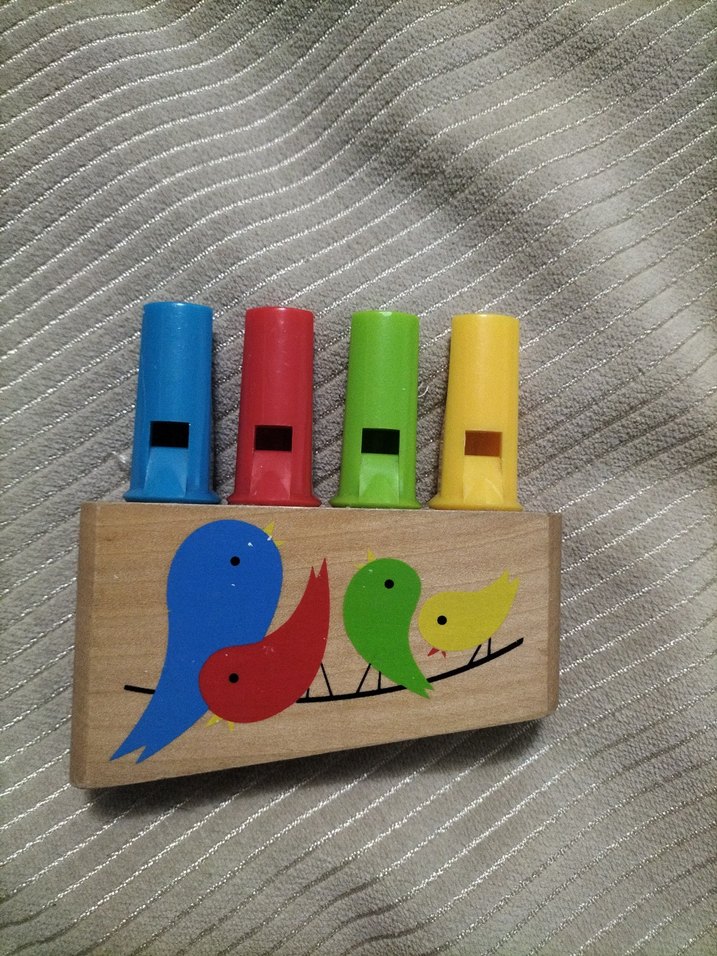 Dört renkli düdüklü, kuş figürlü ahşap müzikli oyuncak. Çocuklar için ses çıkaran eğlenceli bir oyuncak. Hape marka gökkuşağı