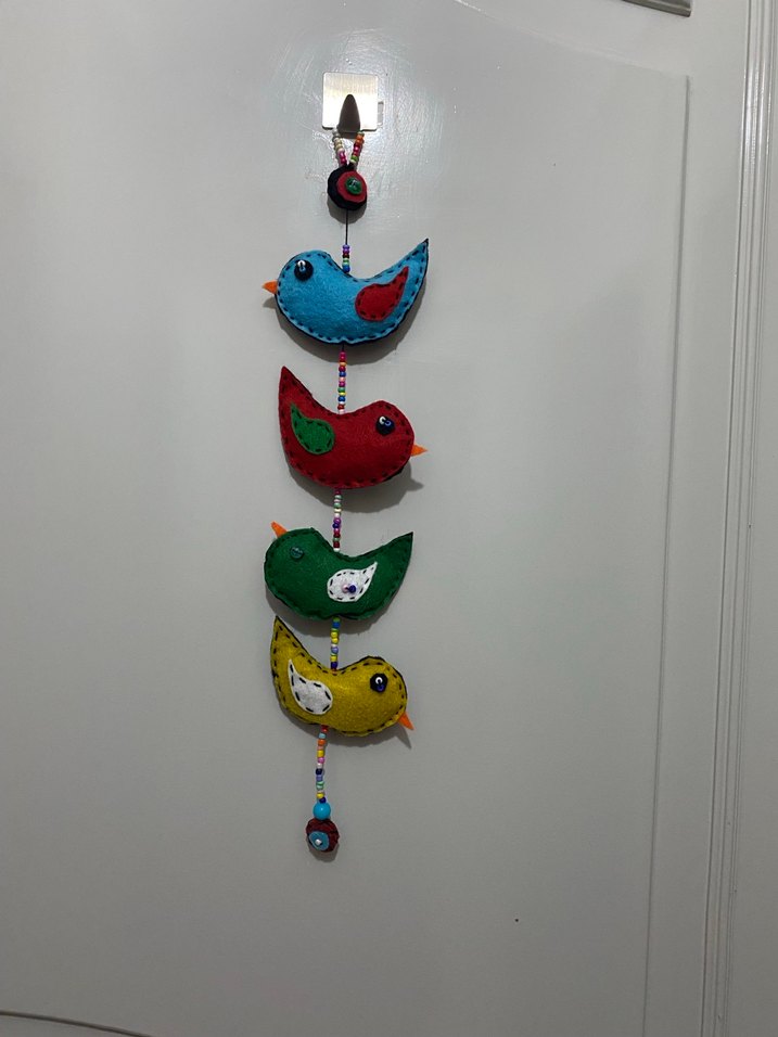 Dört renkli kuş figüründen oluşan, boncuklarla birbirine bağlı dekoratif duvar süsü. Odaya neşeli bir hava katar el yapımıdır keçedendir.