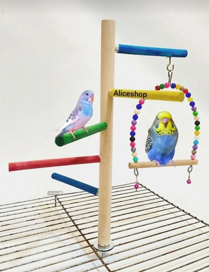 Kafes üstü. Doğal ahşap malzemeden yapılmış, çok renkli kuş tüneği ve boncuklu salıncak içeren kuş oyuncağıdır.