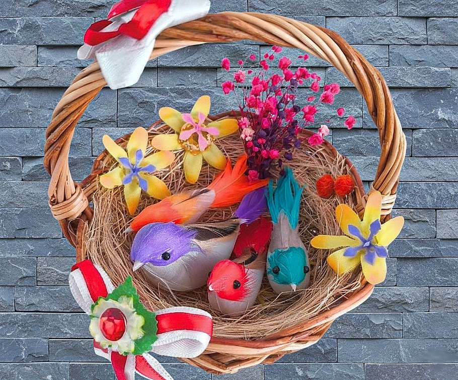 Canlı renklerde yapay kuşlar ve çiçeklerle süslenmiş, doğal görünümlü yuva tabanlı dekoratif sepet. el yapımıdır hediyelik eşya