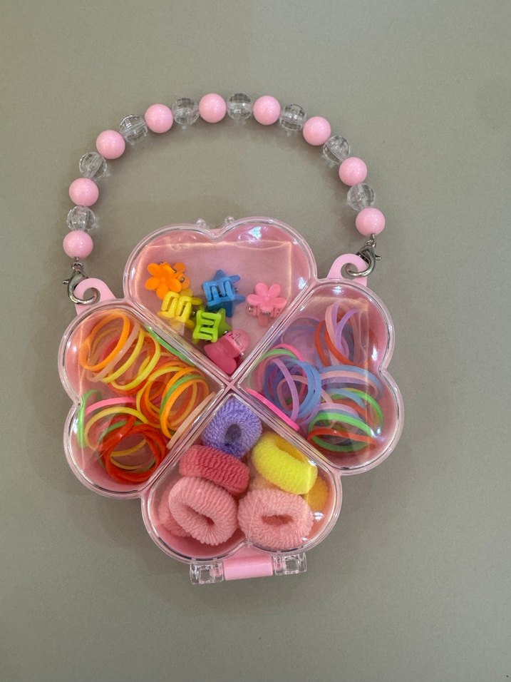 Lastikli ve renkli tie-dye desenli saç tokaları, kalp şeklinde kutuda boncuklu sapla düzenlenmiş.