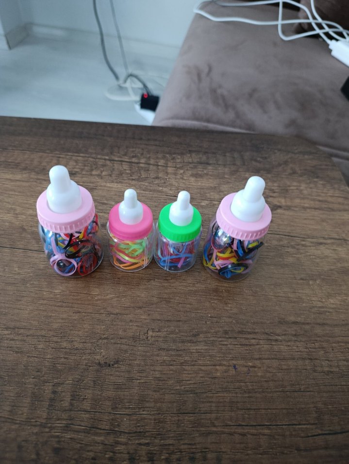 Renkli, lastikli çocuk saç tokaları seti. Bağlama desenli ve canlı çok renkli. Bebek biberonu şeklinde küçük kutularda. 4 adettir