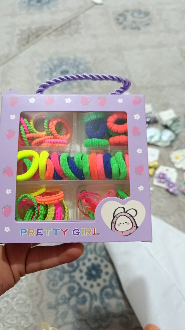 Çocuklar için lastikli, renkli ve tie-dye desenli saç tokaları seti. Bohem ve retro tarzına uygun. Kutuda "PRETTY GIRL" yazısı bulunur.