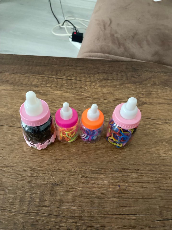 Renkli lastikli çocuk saç tokaları, tie-dye desenli ve bebek biberonu şeklinde kaplarda sunuluyor. Temel kullanım için uygun. 4 adettir