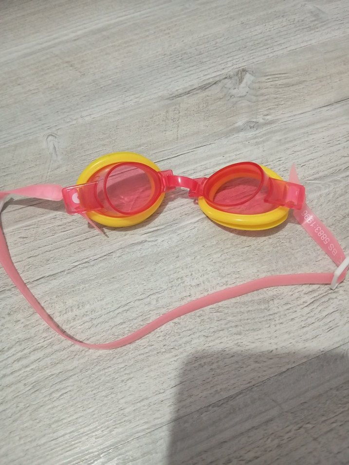 Pembe lastikli ve sarı çerçeveli renkli yüzücü gözlüğü, plajda rahat ve sıkı uyum sağlar. Trend ve minimalist tarzlar için uygundur.