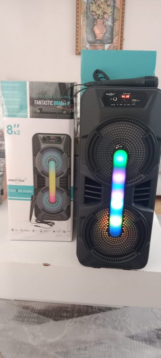 Çift 8 inç sürücüye sahip Bluetooth hoparlör, renkli LED ışıklarla donatılmıştır. Kablosuz bağlantı ve net ses sağlar. Panelinde 'FANTASTIC' yazısı bulunur.
